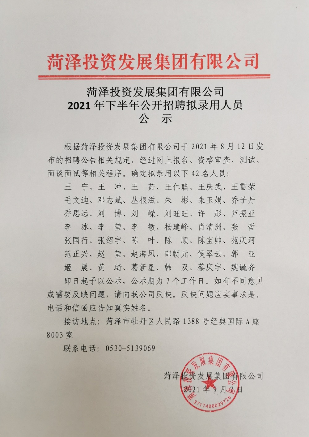 菏澤投資發展集團有限公司2021年下半年公開招聘擬錄用人員公示