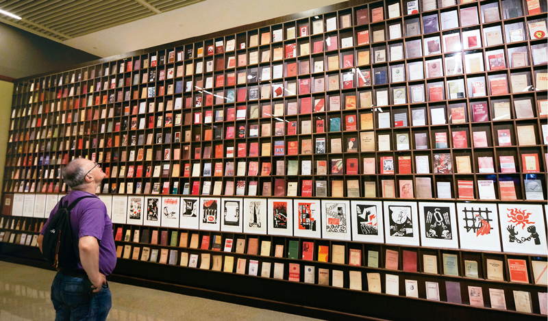 2018年5月9日,一位外國觀眾被北京“真理的力量——紀念馬克思誕辰200周年主題展覽”中一面展示不同國家出版的500多種《共產黨宣言》的書墻所吸引。