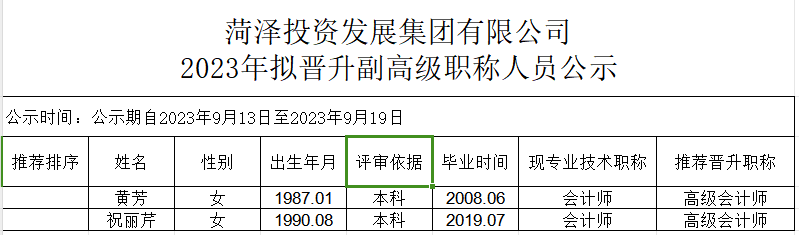菏澤投資發(fā)展集團(tuán)有限公司2023年擬晉升副高級(jí)職稱人員公示